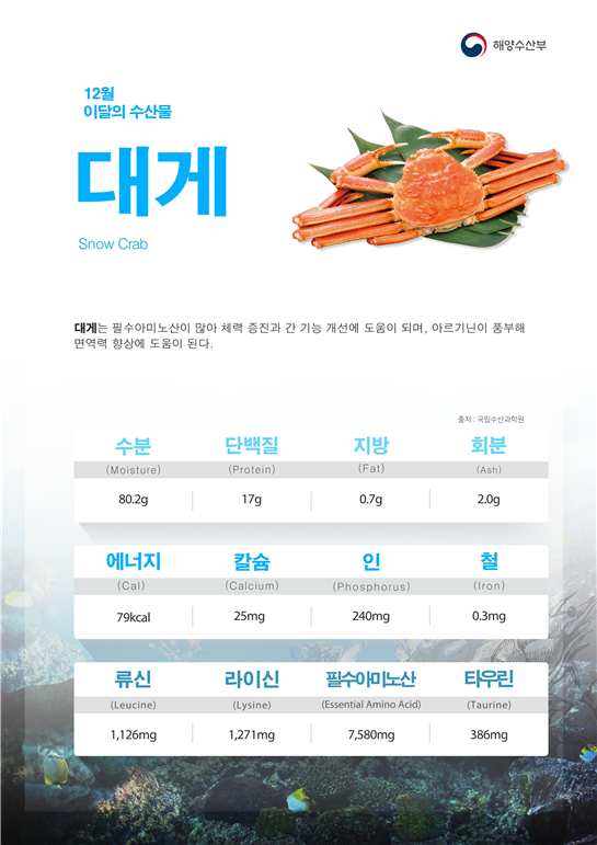 12월 수산물소개‘대게’대게는 양념 없이 그대로 찌거나 삶기만 해도 살이 부드럽고 단맛이 나며, 살을 발라 먹고 남은 몸통 갑(뚜껑)에 따뜻한 밥과 김, 참기름을 넣고 비벼 먹는 것도 별미다. 전체적으로 형태가 같은 속의 유사종인 홍게와 매우 유사하지만 홍게보다 더 고급 어종으로 대우받는다. 몸통의 껍데기는 둥근 삼각형으로, 갑장(甲長)은 수컷이 약 15cm 암컷은 약 8cm 정도로서, 수컷이 암컷에 비해 크다. 몸통의 가장자리에는 작은 가시들이 늘어서 있고, 윗면에는 납작한 사마귀모양 돌기가 흩어져 있다. 다리는 집게다리를 포함해 총 10개다. 수심 200∼600m에서 서식하며, 어장(漁場)은 수심 200m, 수온 1~3℃ 부근이다. 7~8년 동안 1회 탈피하여 성숙하며, 갑피(甲皮)가 11~12cm 정도가 되기까지 약 15년이 걸릴 정도로 성장이 느리다. 우리나라의 동해를 비롯하여, 러시아의 캄차카반도, 일본, 알래스카주, 그린란드에 분포하며 물고기의 시체, 작은 물고기를 비롯하여 게, 새우, 오징어 등을 먹이로 한다. 우리나라에서는 경북 영덕대게가 유명한데, 원래는 주 서식지가 울진 근해이므로 울진대게였던 것이 영덕 상인들이 대게를 내다 팔면서 영덕대게라는 이름이 유명하게 되었다. 겨울에서 봄으로 넘어오는 12~3월이 바로 대게의 살이 가장 토실토실하게 물이 오르는 제철이다.