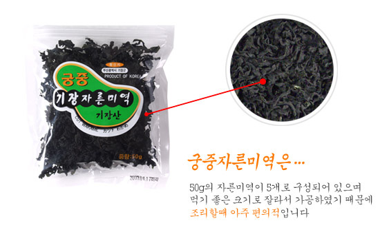 ▶기장미역의특징 기장미역(실미역)은 적기(2~3월)에 채취한 미역만을 가공처리(염장)하여 년간소요량을 냉동 보관 후 엄선 선별된 원료만을 세척, 건조, 위생포장하였으므로 년 중 품질 차이가 없으며, 이는 생산자와 계약생산하고 실명을 하기 때문에 품질이 확실합니다. 미역을 가공처리(염장) 하였으므로 가닥미역처럼 오랫동안 헹궈내실 필요 없이 손쉽게 드실 수 있습니다. ▶자른미역제품특징 ①기장의 신선한 미역을 위생적으로 건조시켜 원료만을 짧게 잘라 소량포장 했습니다. ②소비자의 복합적인 조리문화에 보다 맛과 편의를 고려하여 만들어진 제품입니다. ③물에 씻거나 물에 불릴 필요없이 끓는 물에 넣어 조리하여 맛있게 드실수 있습니다. ④소포장이라 휴대하시기 편리하며 미역국뿐만 아니라 계절별 여러가지 음식에 응용하여 드실수 있습니다. ▶제품용도 국거리, 비빔밥, 쌈, 겨자냉국등 ▶조리방법 간편한 미역국 조리 큰 미역을 자를 필요없이 소비자의 입장에 서서 먹기 좋은 크기로 잘라서 가공하였기 때문에 조리할때 아주 편의적입니다. 여름철 미역냉국 무더운 여름철에 미역냉국으로서 간편하게 조리하여 맛있게 드실수 있습니다. 된장국 및 라면, 찌개대용 생활속에 주로 드실수 있는 된장국,찌개 및 라면,국거리를 조리하실때에도 함께 뿌려 드시면 더 더욱 색다른 맛을 즐길 수 있습니다. ※보관방법 직사광선과 습기를 피하고 개봉 후 남은 제품은 간이 필 우려가 있으니 밀봉 보관 하세요 |