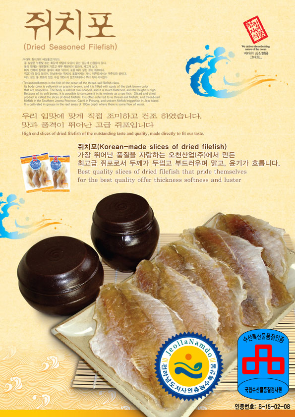오천산업(주)에서 생산하고 있는 국산 쥐치포는 국산 쥐치어를 직접 수매하여 우리 입맛에 맞게 조미하고 건조시켜 만든 쥐치포로서 같은 쥐치포(쥐포) 중에서도 가장 뛰어난 품질을 자랑하고 있습니다. 두께가 두껍고 부드러우며 빛깔이 맑고 투명하며, 윤기가 흐릅니다. 공장자체에 원료 및 제품등을 보관할 수 있는 냉동실 등을 이용하여 원료 및 제품을 보관하고 있으며, 세척 및 성형과정을 거친 쥐치포를 냉풍건조실에서 건조하여 해충, 먼지 등으로 인한 2차 오염을 차단하였으며 각 공정공정마다 공기살균기, 금속탐지기를 비롯한 철저한 위생시설 및 관련시스템, 그리고 당도측정기, 염도측정기, 수분측정기 등을 이용한 체계적인 품질관리설비 및 시스템 등을 통하여 보다 위생적이며 체계적으로 생산된 한차원 높은 제품입니다. 이러한 수준 높은 쥐치포를 생산하고 있는 오천산업(주)는 1988년에 설립이래 한국표준협회의 ISO9001(품질경영체제)인증, 국제품질인증원의 HACCP 인증을 받은 것을 비롯하여 각종특허 획득, 중기청의 벤처기업인증, 이노비즈기업인증, 수출유망중소기업인증 등 각계에서 그 능력을 인정받고 있고 있는 믿을 수 있는 기업으로 성장해 오고 있습니다. |