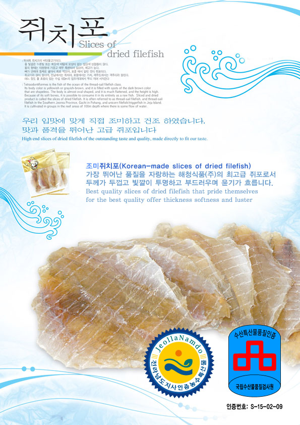 해청식품(주)에서 생산하고 있는 국산 조미 쥐치포는 국산 쥐치어를 직접 수매하여 우리 입맛에 맞게 조미하고 건조시켜 만든 쥐치포로서 같은 쥐치포(쥐포) 중에서도 가장 뛰어난 품질을 자랑하고 있습니다. 두께가 두껍고 부드러우며 빛깔이 맑고 투명하며, 윤기가 흐릅니다. 공장자체에 원료 및 제품등을 보관할 수 있는 냉동실 등을 이용하여 원료 및 제품을 보관하고 있으며, 세척 및 성형과정을 거친 쥐치포를 냉풍건조실에서 건조하여 해충, 먼지 등으로 인한 2차 오염을 차단하였으며 각 공정공정마다 공기살균기, 금속탐지기를 비롯한 철저한 위생시설 및 관련시스템, 그리고 당도측정기, 염도측정기, 수분측정기 등을 이용한 체계적인 품질관리설비 및 시스템 등을 통하여 보다 위생적이며 체계적으로 생산된 한차원 높은 제품입니다. 이러한 수준 높은 쥐치포를 생산하고 있는 해청식품(주)는 국제품질인증원의 ISO9001(품질경영체제)인증 및 HACCP 인증을 받은 것을 비롯하여 중기청의 수출유망중소기업으로 인정받는 등 믿을 수 있는 기업으로 성장해 오고 있습니다. |
