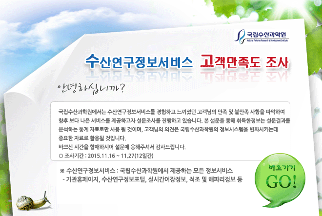 2015년 국립수산과학원 수산연구정보서비스 고객만족도 설문조사 https://www.nfrdi.re.kr/bbs?id=notice&flag=pre&boardIdx=17441&site=&cPage=1 |