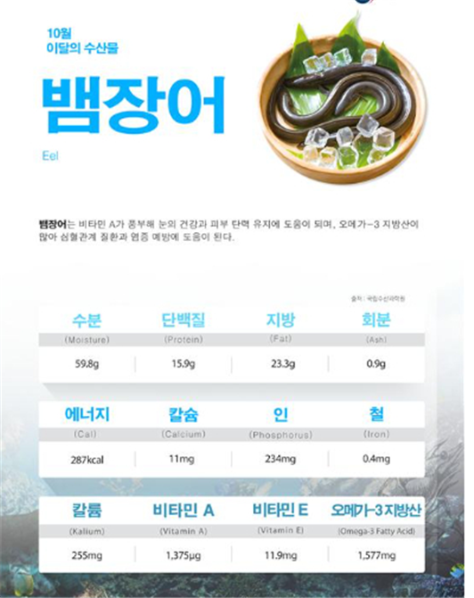 10월 수산물소개‘뱀장어’뱀장어는 강에서 살다가 바다로 가서 알을 낳고 부화된 실뱀장어는 다시 강으로 거슬러 올라와 생활하므로 ‘민물장어’라고도 불린다. 학명은 Anguilla japonica이며, 영어로는 Japanese eel이라고 하며, 일본어로는 우나기(ウナギ)라고 한다. 뱀장어는 뱀장어목 뱀장어과에 속하는 어류로 몸에는 타원형의 미세한 비늘이 있지만 살갗에 묻혀서 없는 것처럼 보이기도 한다. 아래턱이 위턱보다 앞으로 튀어나와 있다. 배지느러미가 없고, 등지느러미와 뒷지느러미, 꼬리지느러미는 하나로 연결되어 있고 끝이 뾰족하다. 옆줄에 있는 감각공이 뚜렷이 보인다. 뱀장어의 몸 색깔은 사는 장소나 시기에 따라서 약간씩 차이가 난다. 민물에서 바다로 이동할 때는 짙은 검은색으로 변한다. 크고 작은 하천, 호수 및 저수지 등 모든 담수 온난한 수역에서 서식한다. 뱀장어는 육식성으로 새우, 게, 수서곤충, 실지렁이, 어린 물고기 등 모든 수중동물을 먹이로 한다. 낮에는 굴속, 돌 밑, 진흙 속에 숨어 있고 주로 밤에 활동한다. 우리나라에서는 삼척 오십천 이북의 동해안으로 유입되는 하천을 제외한 전 하천에 서식한다. 일본, 중국, 타이완 및 베트남 등지에도 분포한다. 뱀장어(민물장어)는 단백질과 불포화지방산, 비타민이 풍부해 여름철 대표 보양식으로 활용되며, 오메가-3 지방산이 많아 심혈관계 질환과 염증 예방에도 도움이 된다. 특히 부추나 생강과 함께 먹으면 소화가 잘되고 특유의 비린내가 없어져 더 맛있게 먹을 수 있다.