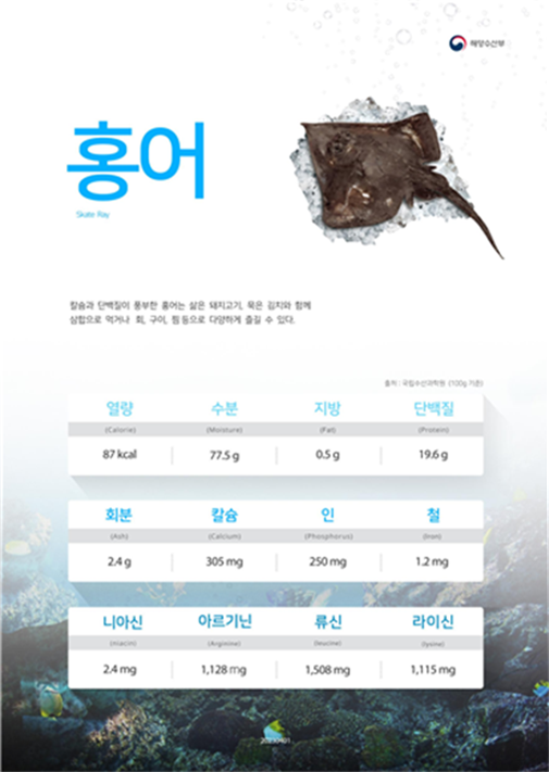 ‘홍어’홍어는 예로부터 전라도 지역에서 주로 먹는 향토 음식이었지만, 최근 전국적인 인지도에 힘입어 고급 음식으로 인기가 높다. 홍어의 몸은 마름모꼴로 폭이 넓으며 머리는 작고 주둥이는 짧으나 돌출하였으며, 눈은 작고 분수공은 눈의 바로 뒤쪽에 가깝게 붙어 있다. 또 홍어의 가슴지느러미는 크고 배지느러미는 작은 편이며 꼬리에 2개의 작은 등지느러미와 꼬리지느러미가 있으나 뒷지느러미는 없다. 홍어의 산란기는 가을에서 이른 봄인데 11월에서 12월에 산란이 가장 성하다고 한다. 홍어는 암수 교미에 의해 수정되지만 난생으로 4~5개의 알을 산란, 알은 길이 약 6cm, 폭 4cm인 직사각형 모양인 단단한 물질에 쌓여 있고, 네모서리에는 독기물을 내어 해조류에 감겨 붙어 있으며 산란 후 3~8개월 만에 부화되어 몸체 폭이 5cm인 새끼가 태어난다. 홍어는 톡 쏘는 맛이 나도록 삭혀서 막걸리를 곁들여 먹는 홍탁이 유명하며, 전남 서남해안 지방에서는 잔치 음식에 삭힌 홍어가 거의 빠지지 않는다. 이른 봄에 나는 보리싹과 홍어 내장을 넣어 ‘홍어 앳국’을 끓이기도 하며, 회, 구이, 찜, 포 등으로 먹기도 한다. 쫄깃한 식감과 특유의 알싸한 향이 나는 홍어회를 묵은지와 돼지고기 수육을 곁들인 '홍어삼합'은 남도 지역의 대표 별미다. 또한 홍어는 수분이 많고 단백질이 풍부하여 칼슘의 좋은 공급원이며, 성장기 어린이의 뼈 성장과 성인의 골다공증 예방에 좋은 효과가 있다. 홍어의 단백질을 구성하는 아미노산의 조성을 보면, 글루탐산, 아스파르트산, 라이신, 루신 등의 순으로 많으며, 우리나라 사람들이 부족하기 쉬운 라이신과 트레오닌을 다량 함유하고 있다.